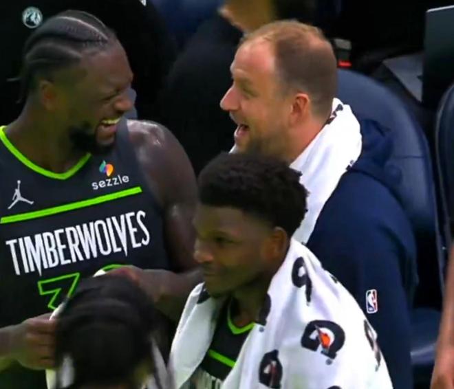 随后兰德尔又咧嘴大笑着和英格尔斯说了些什么,一旁的爱德华兹似乎也在憋笑。