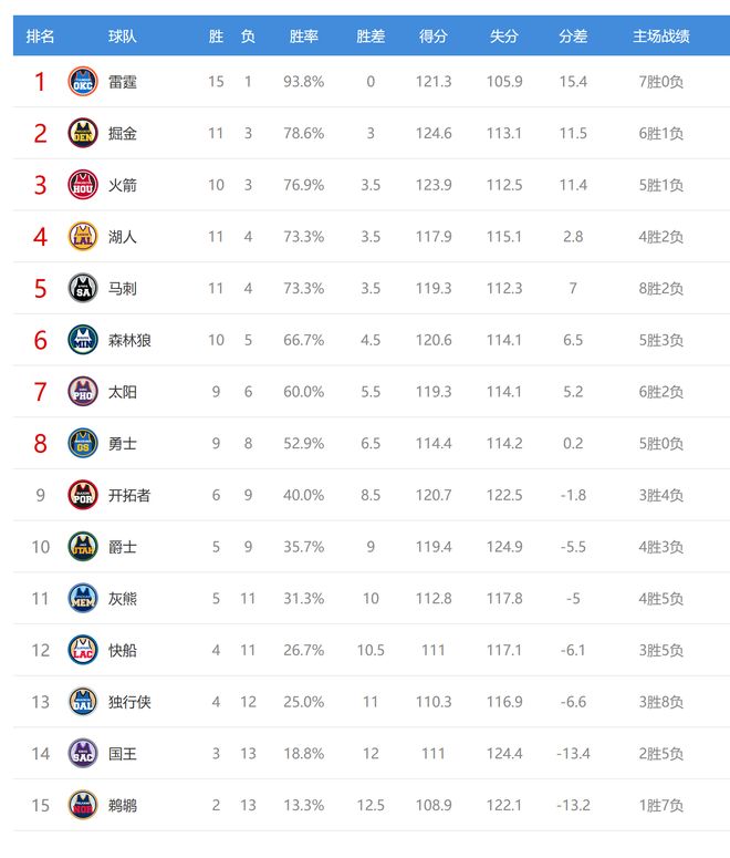 马刺赢球后取得3连胜,战绩11胜4负排名西部第五,他们和西部第二的掘金(11胜3负)只有0.5个胜场差,马刺有希望冲到西部第二。
